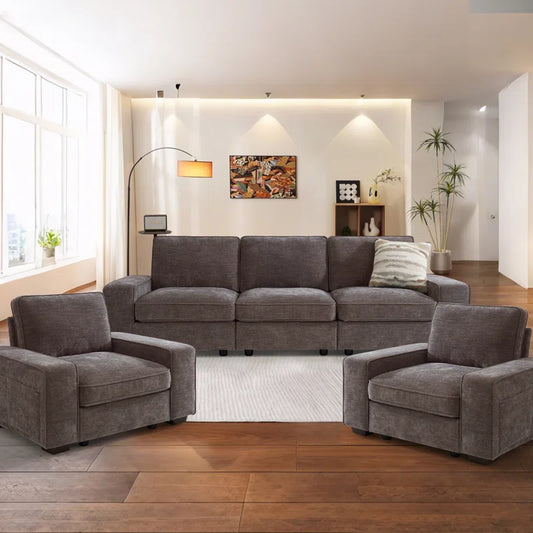 5 Seater Sofa: Modern Modular Sectional Sofa Set of 5 Seater Chenille Couch with Storage Space and USB Port for Living Room(Dark Grey Chenille)