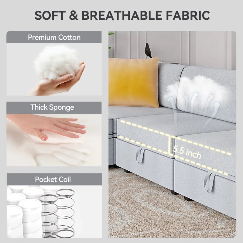 This spacious six-seat L-shaped sofa will improve the comfort and usefulness of your home. With its contemporary charging capabilities and useful storage options, this sofa combines convenience and style. Different space requirements can be accommodated by the variable configuration made possible by the modular design. This sofa not only provides outstanding comfort and durability but also gives your living space a sleek, modern look with its superior linen fabric and contemporary minimalist style.