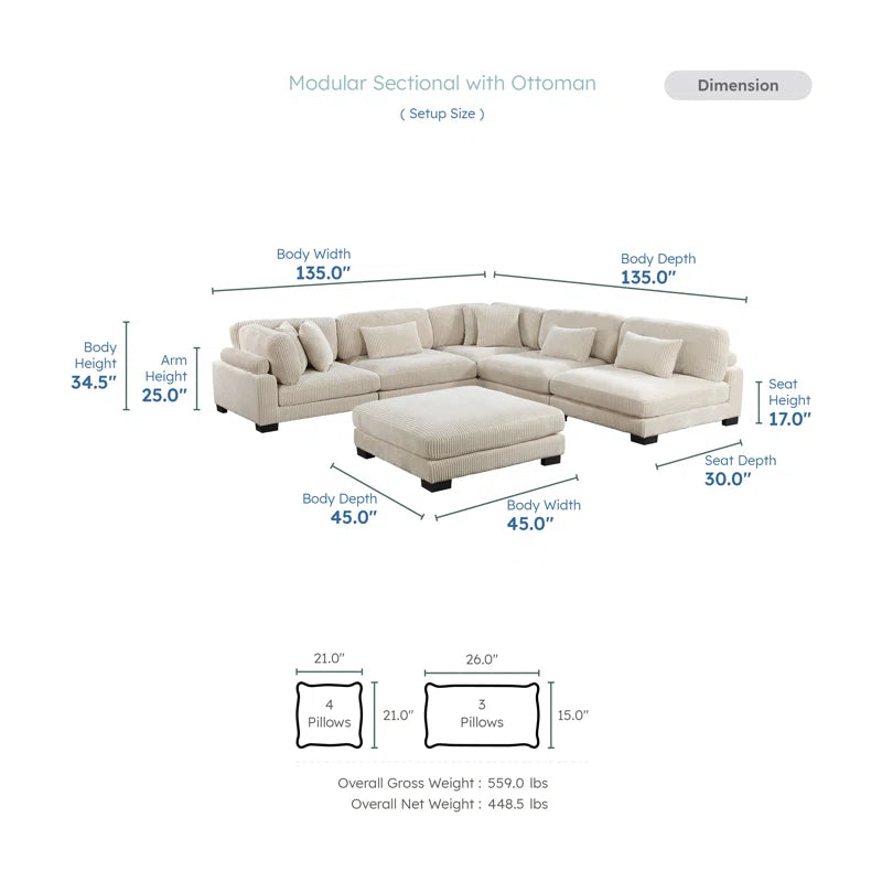 L Shape Sectional Sofa: 135”W Modern Corduroy Track Arm Modular Sectional Sofa(Beige Corduroy)