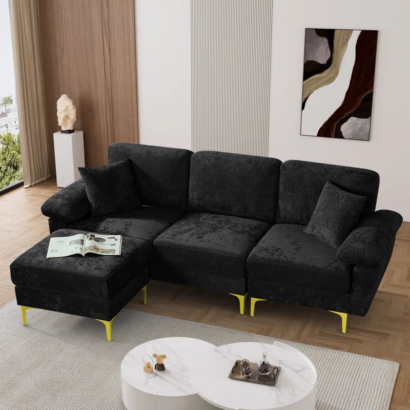 L-Shape Sectional Sofa: 3 - Piece Upholstered Sectional with Ottoman(Black Polyester)