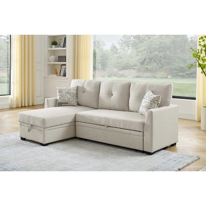 This L-shaped pull-out sleeper sectional is perfect for giving a comfortable, relaxed feel to a variety of locations. Because of its produced wood frame construction and linen upholstery in any neutral color, it may be easily combined with a wide range of color schemes. In addition to two throw pillows with tufted back cushions, this sofa has medium-firm seat cushions and soft back cushions. The best part is that the chaise has lift-up storage within, so you can prepare extra blankets, pillows, and sheets for your guests who are visiting from out of town.
