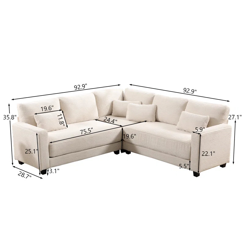 The 92.9'' Wide Modern Corduroy L-Shaped Sectional Sofa will add a comfortable yet elegant touch to your living area, elevating your house. This couch, which is wrapped in plush, textured corduroy fabric, has a cozy, inviting feel that makes it ideal for entertaining, reclining, or unwinding after a long day. With four matching pillows added for added comfort and style, its roomy 92.9" width offers plenty of sitting for family members and visitors.The sofa is made with generously padded cushions and sturdy backrests to provide long-lasting comfort and durability. The sleek design and clean-lined silhouette go well with both modern and transitional decor styles.
