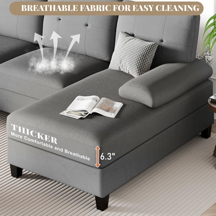 - The design of the sectional is understated yet sophisticated. This sectional's sturdy construction, soft fabric, and finely stitched accents guarantee its excellent quality and structural stability. The pocketed coil spring mechanism and the high-density foam cushioning in the cushions make for a comfortable sitting experience.