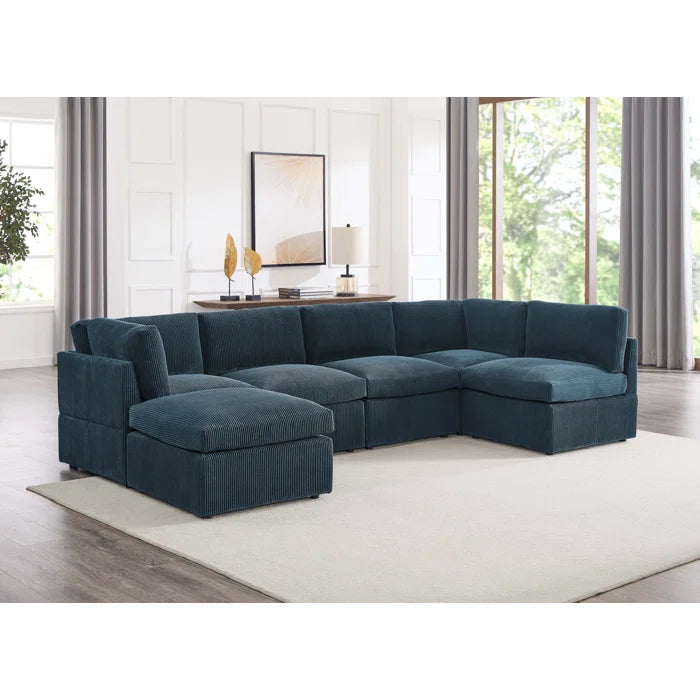 U-Shape Sectional Sofa: 6 - Piece Corduroy Sectional blends modern style with plush comfort(Dark Blue Corduroy)