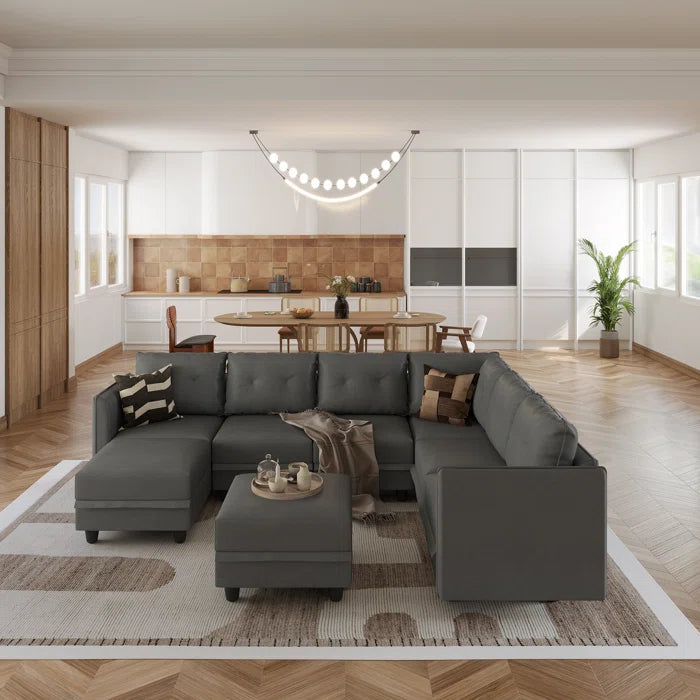 This spacious modular sofa living room set gives your living area a touch of both modern charm and retro-modern design. It has a thick, velvety polyester fabric that is stain and water resistant. Luxurious sitting is provided by modular components with high-density foam, pocketed springs, and a eucalyptus frame that can support a lot of weight.
